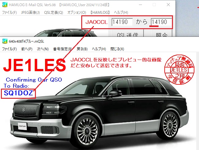 送信前に内容(コールサイン、その他)を確認したいのですが、「イメージ」では送りたい局のコールサイン、その他のデータが確認できません。表示画像が「プレビュー」ですと安心して送信できますがいかがでしょうか?