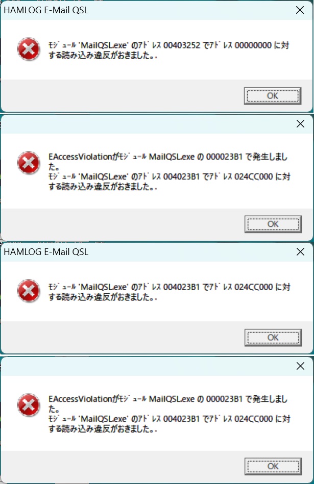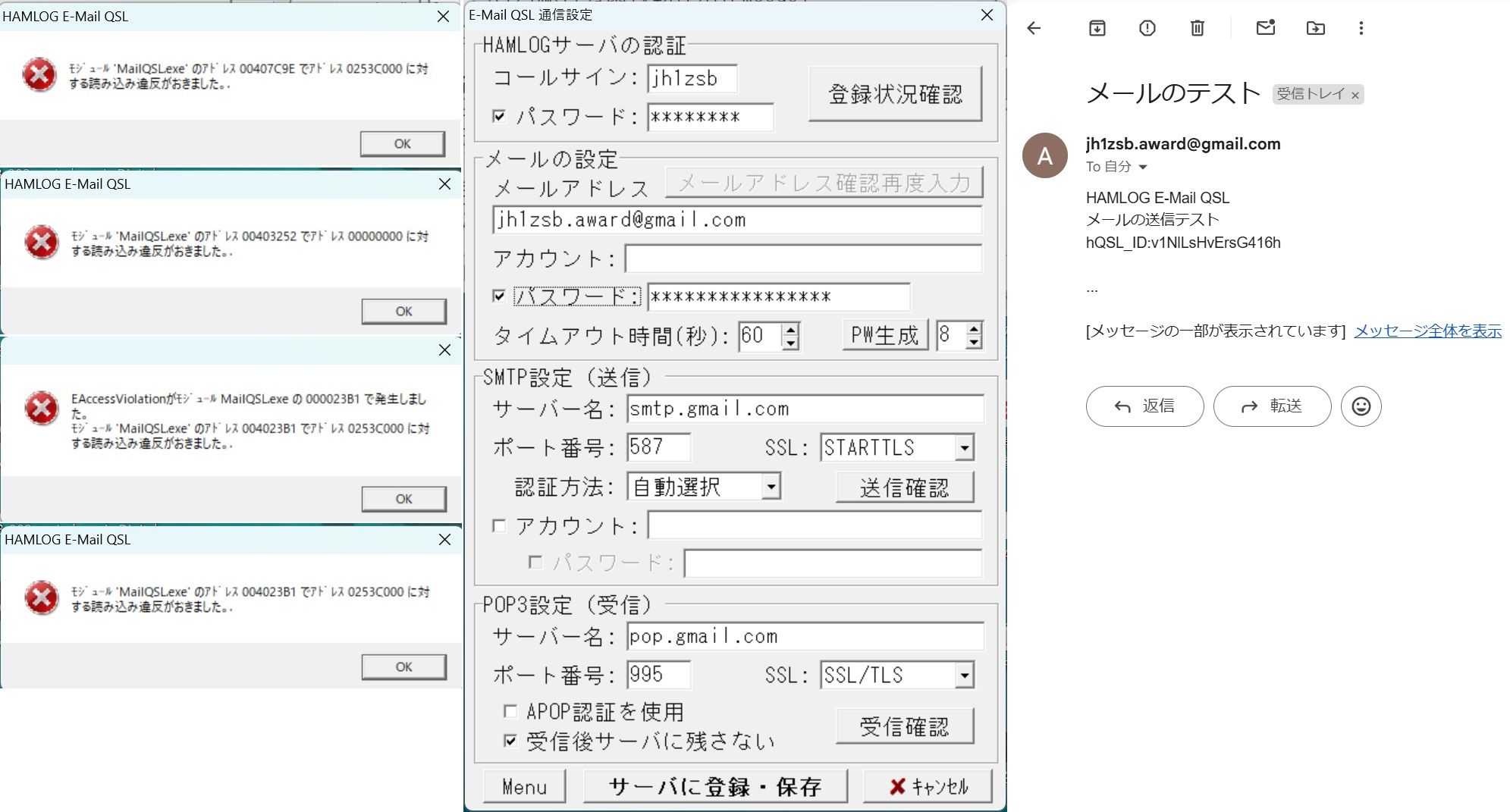 通信設定でSTP設定(送信)はOKで送信確認ボタンをクリックするとテストメールがGmailにhQSL_ID付で来るのですが、POP3設定(受信)で受信確認ボタンをクリックするとプログラムが落ちたりエラー表示がいくつも出たりします(添付画像参照)。