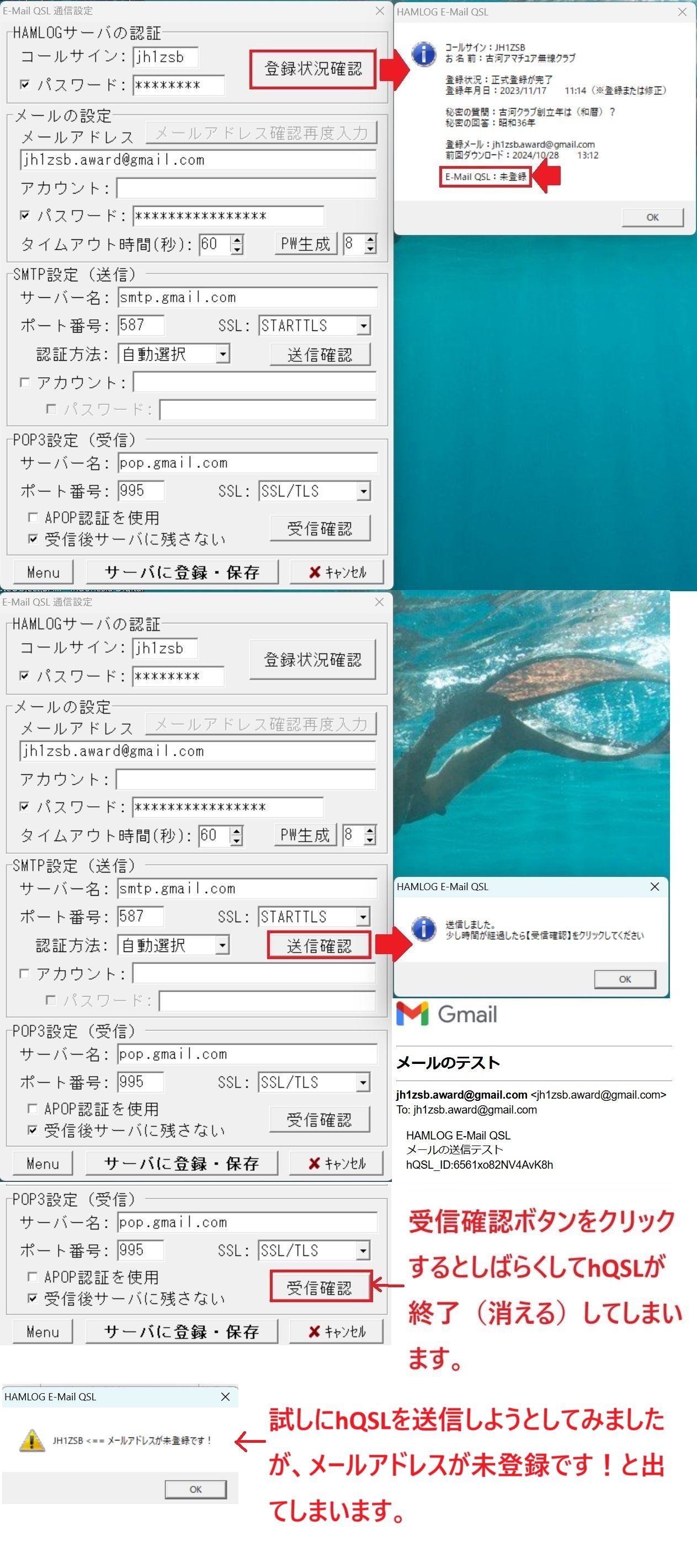 > > このメッセージによるとh−QSLの設定ではなくメール パスワードの問題と思いますが・・
