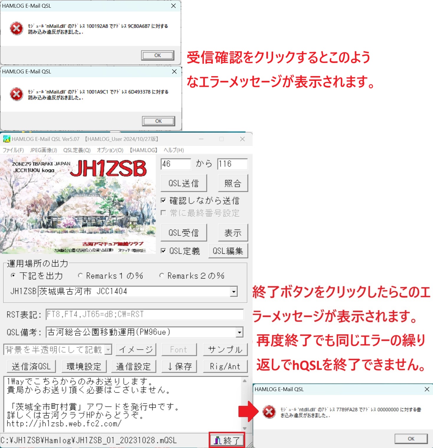 > > > > しかし受信確認ボタンをクリックするとhQSLが終了してしまいます。