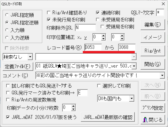 > > お世話になりましす。QSLカード印刷にてコメントで開始を押しても ”印刷対象のデータが見つかりません”と出ます。何が考えられますでしょうか。