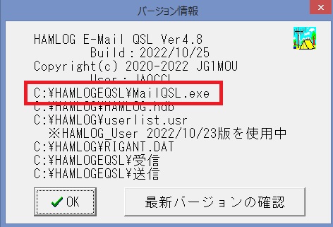 「MailQSL.exe」がHamLogのフォルダ内に出来ていますのでこれを画像の通り