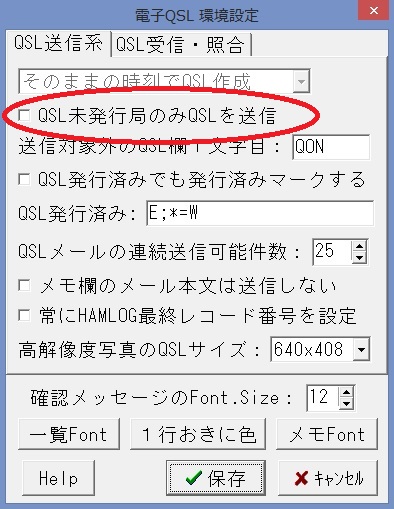 > 2.添付画像(hQSLのメイン画面⇒オプション⇒電子QSL環境設定)の赤丸のチェックを外してhQSLを送る