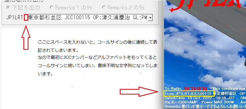 運用場所の出力で自局コールサインの後ろのボックスの先頭に「スペース」を入れないと、ボックス内に最初にJCC等アルファベットをもってきた場合、自局コールサインと引っ付いて意味不明な文字の羅列になるので注意が必要です。
