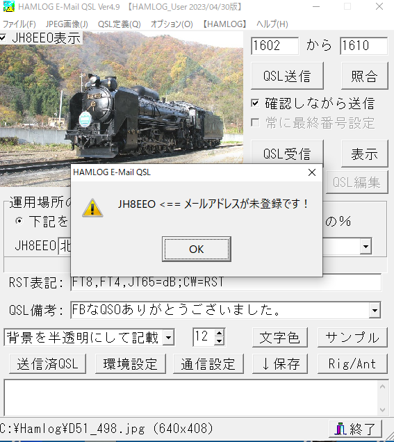 hQSLカード(サンプルのD51)の右にあるQSL送信ボタンを押しても、「JH8EEO←メールアドレスが未登録です!」と表示されます(写真)