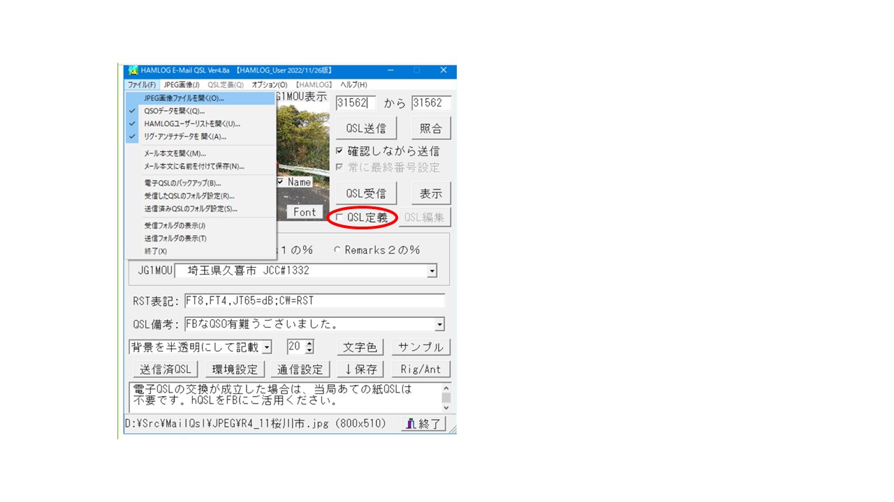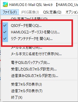 > > hQSLの初期画面の左上のファイルをクリックしたプルダウンメニューで安曇野市かい四角で囲ったところにチェックは付いていますか。