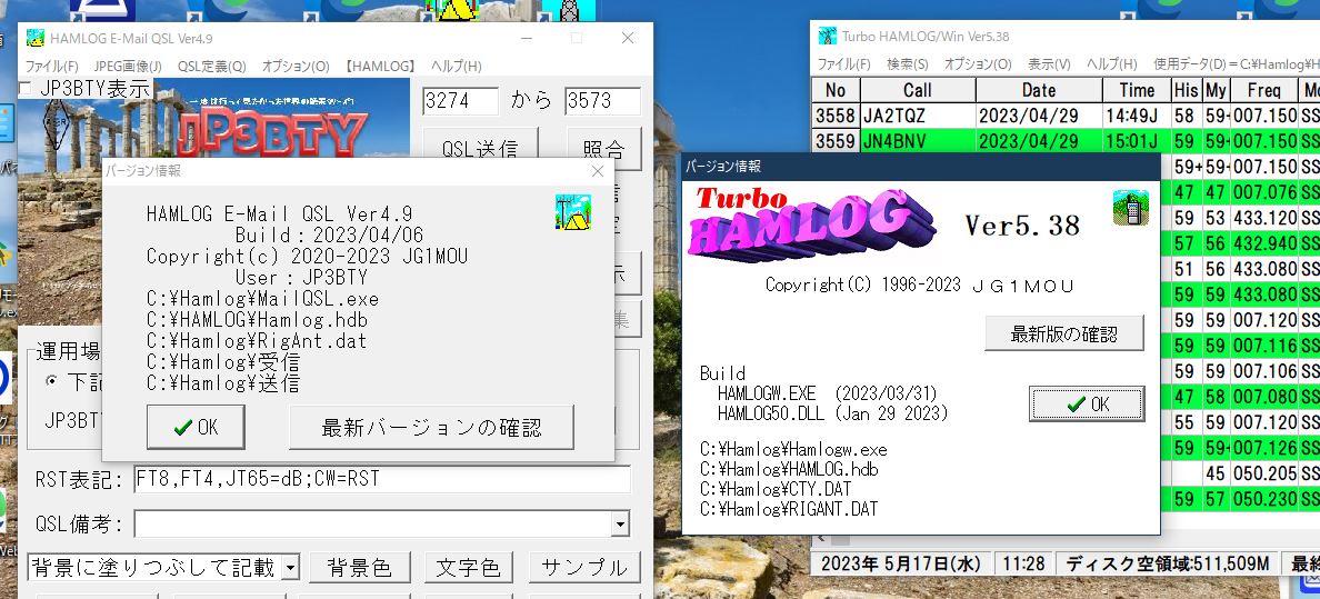 jp3bty/小清水さんのHAMLOG本体、hQSLのバージョン情報の画面確認しました。