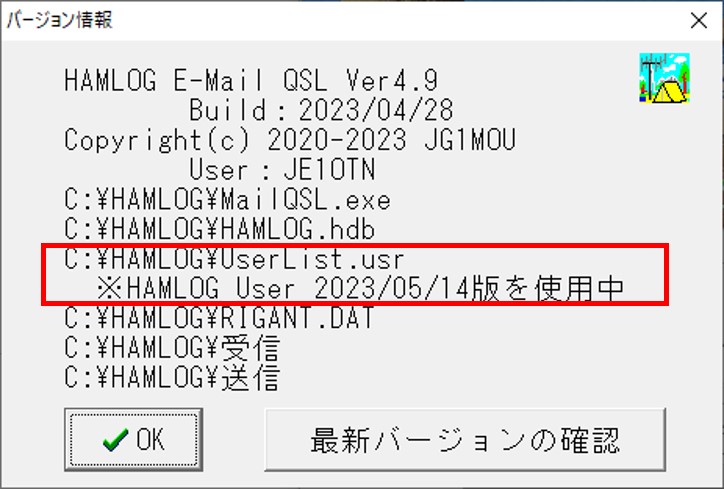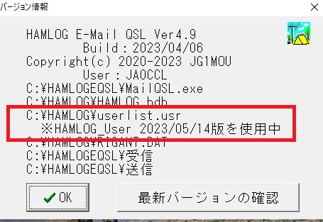 > もしユーザーリストを開いているのでしたら、添付画像のように何年何月何日版のユーザーリストを使用中との情報がバージョン情報画面に出てきます。jp3bty/小清水さんのバージョン情報の画面にはこの部分がありません。