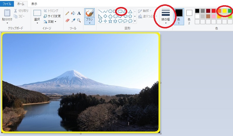 > 添付画像はPC付属の「ペイント」で処理したものです。縁取りの太さは「線の幅」で変更、一番太くしましたが。色も選択できます。