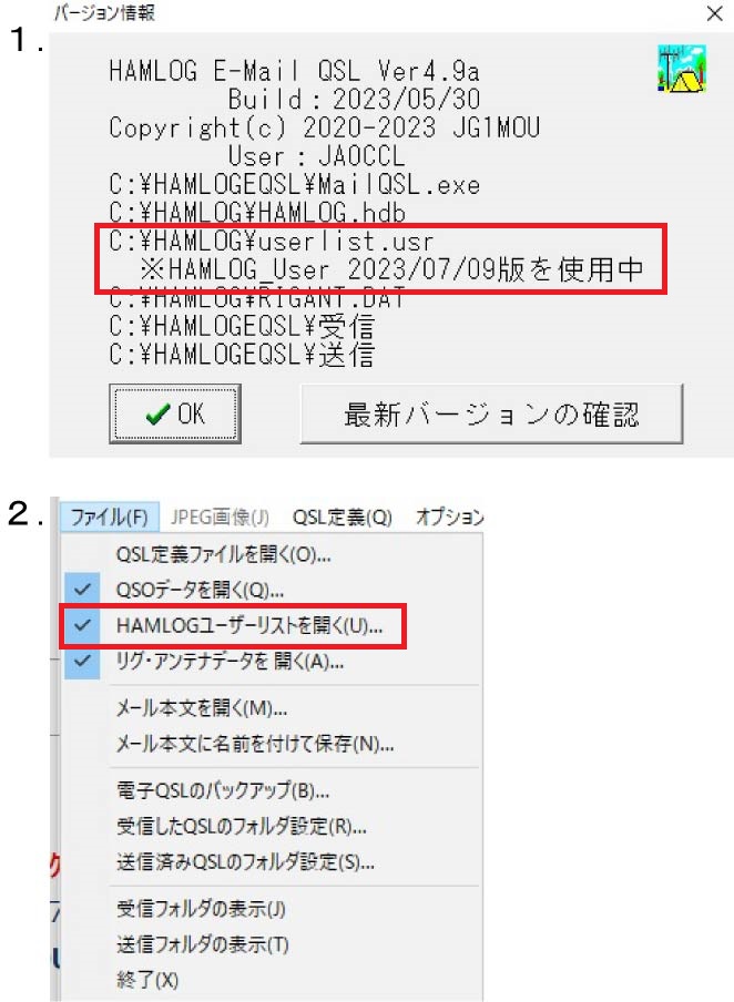 添付画像をしっかり見てください。1.はhQSLの初期画面のヘルプのプルダウンのバージョン情報です。赤で囲ったところが私が使用しているユーザーリストの在り場所です。上で書いたようにHAMLOGのフォルダとhQSLのフォルダは最初hQSLが始まった時から完全に分けていますがユーザーリストはHAMLOGのフォルダのものを使用しています。