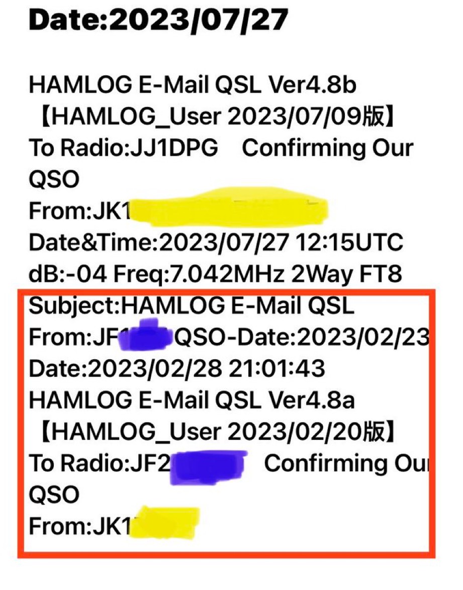 > > メール本文に、関係ないhQSLのデータが貼り付いて