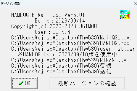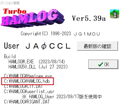 > > > 添付画像は私のHAMLOGのバージョン情報です。先日アップしたように私はHAMLOGとhQSLは別フォルダで運用していますがhQSLもこのc:\HAMLOGのhdbを指定していますから問題なく動いています。