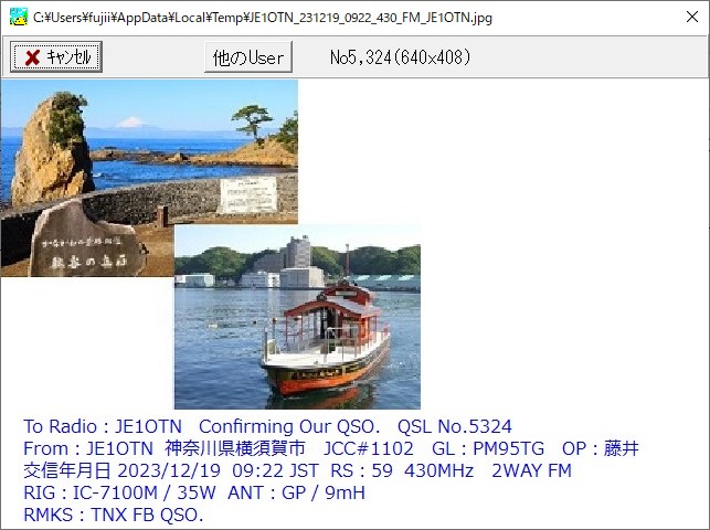 > グラフィックソフトやPowerPointなどで2枚の写真画像を重ねて、それをJPEGファィルとして保存しhQSLに取り込むというのであれば、添付画像のような感じのものはできました。