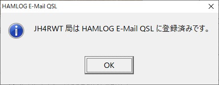 送信確認と受信確認が問題なく動作した場合に限り、HAMLOGサーバにメールアドレスが登録され、電子QSLの送受信ができるようになります。」