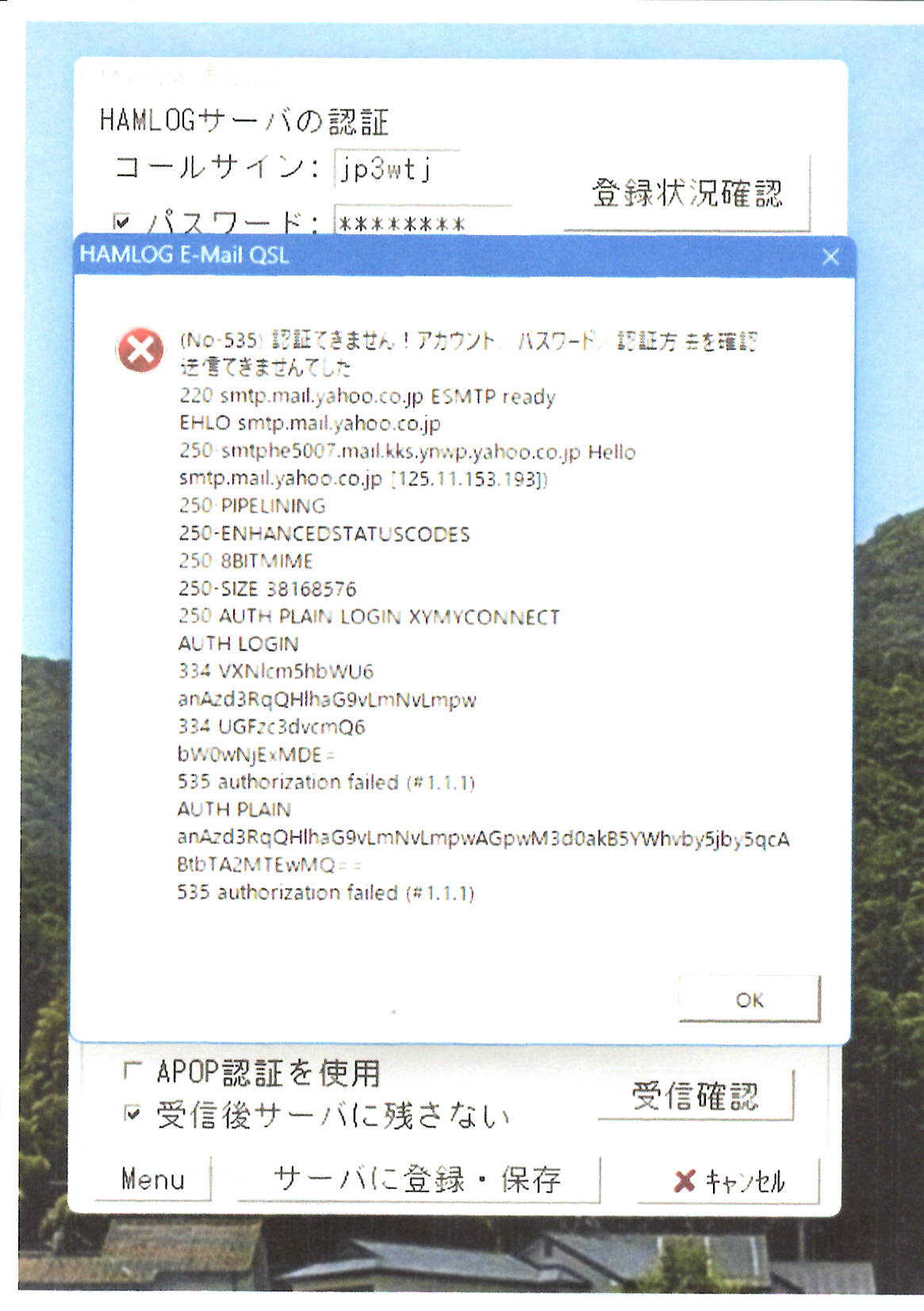通信設定が隠れているので何とも言えませんが、535番の認証エラーが出てます。