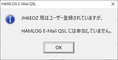 > > > 「HAMLOG E-mail QSLの参加局、または電子QSL送信対象の局がいませんでした。・・・・・」のメッセージが表示され、送信用の自局のhQSL画面が表示されません。