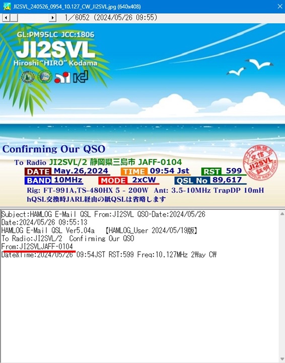 > > 時々、メモ欄のFromに変な情報が入っているhQSLをみたことがありました。これまで気にしていませんでしたが、発行するhQSLのメモ欄がどのようになっているか、自身あてに送信してみました。私は、QSL定義を使っているので、運用場所の出力はグレーアウトになりますし、その項目が入力されると思っていませんでした。実際に自身に送信したhQSLを見ると、Remarks1の%の内容がFromに入力されていました。hQSLのメニューで「Remarks1の%」のチェックが入ったままでグレーアウトでした。これは仕様でしょうか? 仕様であれば、QSL定義を仕様する場合にも、きちんと選択しておく必要がありますね。メール部分以外のTo Radio 〜 Date&Timeだけでもプレビューできればありがたいです。Ver5.04a