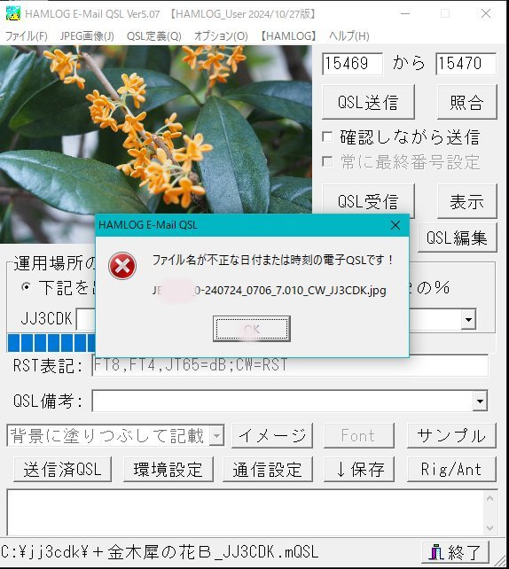 > QSL受信をクリックし、電子QSLとQSOデーターを照合にすると、ファイル名が不正な日付けまたは