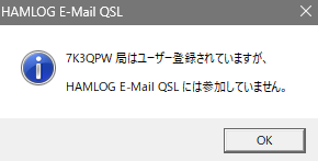 もしくは、hQSLメイン→オプション(O)→E-Mail QSL 通信設定(C)→[登録状況確認]ボタンのどちらかですね。