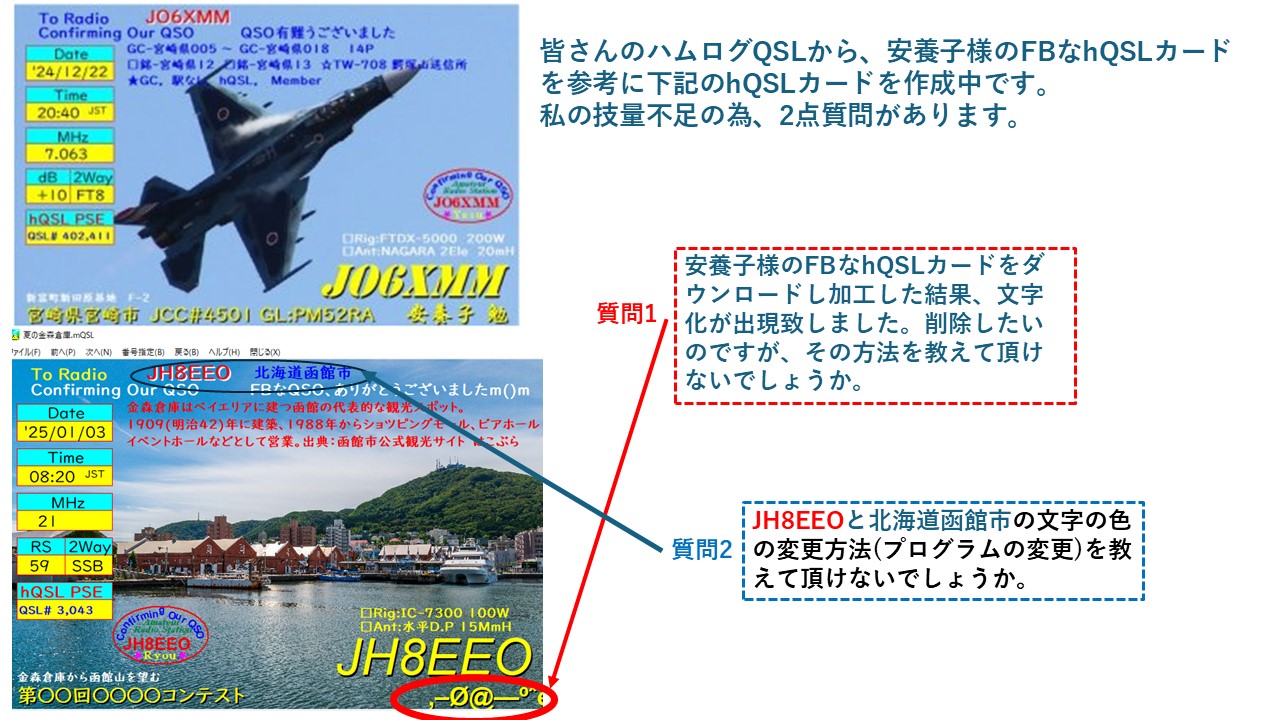 (※QSL編集画面で 命令(C) → フォントの色指定(C)で好きな色を選んでOKを押せば定義文が追加されます)