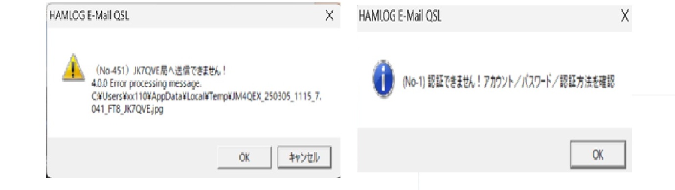 > > > 通信設定のメールアドレスとパスワードを入力しなおし、送信確認が完了するとh-QSLが送信でいましたが、次の送信でまた同じエラーが出て送信できない状態となってます。