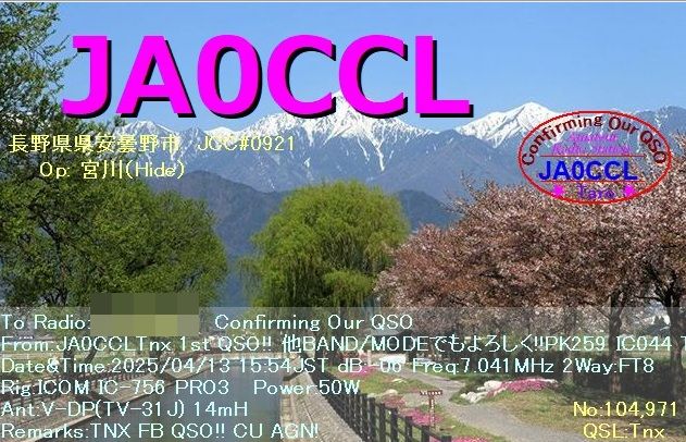 高野さん こんにちは。22/11の下諏訪町移動以来お空の上ではご無沙汰ですが。この時は高野さんから縦長のhQSLをいただいていますね。