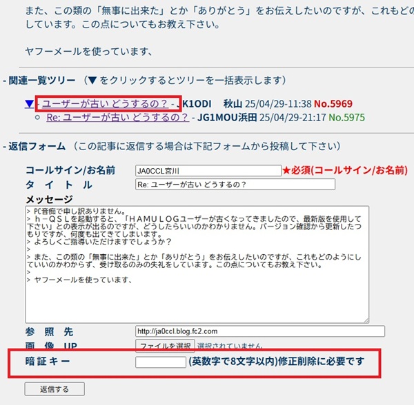 それと下部の「暗証キー」にPWを入力してください。なかには用事がすんだら投稿を削除する方がこの相談室に限らずときおりおいでになりますがね。