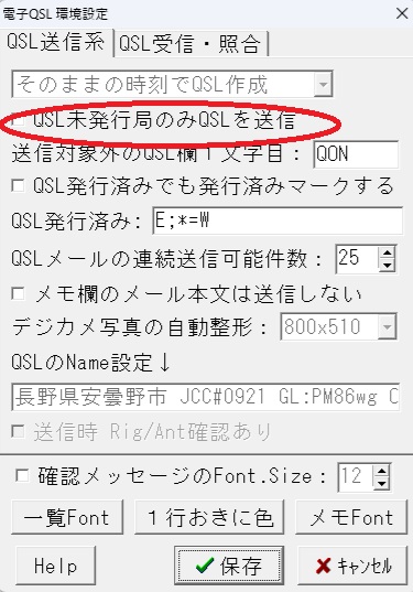 > > HAMLOGのQSL欄の2番目にチェックが付いていると送れませんが、添付画像のように「環境設定」の画面の赤丸を付けた「QSL未発行のみQSLを送信」のチェックを外してください。何回でも送れますから。私は当初からここにはチェックを付けていません。