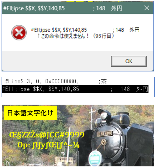 > >エラーメッセージには#Ell;pse ssx,ssy, 140,85, ; 148外円の行が黒く帯状になっていました。