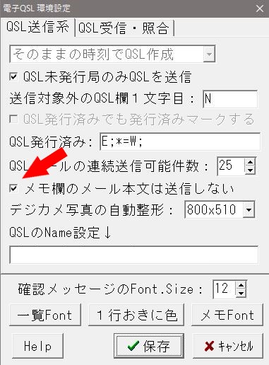 [QSL送信系]のウインドウ(添付画像参照)の【□メモ欄のメール本文は送信しない】に