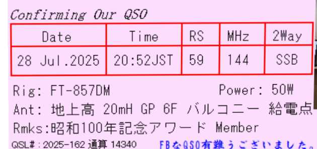 なお、h−QSLを送信しました。またの交信宜しくお願いいたします。