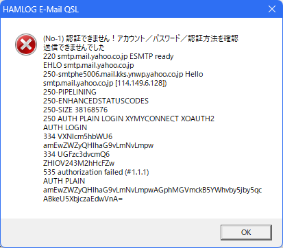 > hQSLはこれまで正常に使用できましたが、「Yahoo!メールから不正ログイン対策」ということでYahooメールパスワードを変更をしたところ、通信設定の送信エラー(添付ファイル参照)でHAMLOGサーバーへの登録ができなくなりました。受信はできています。