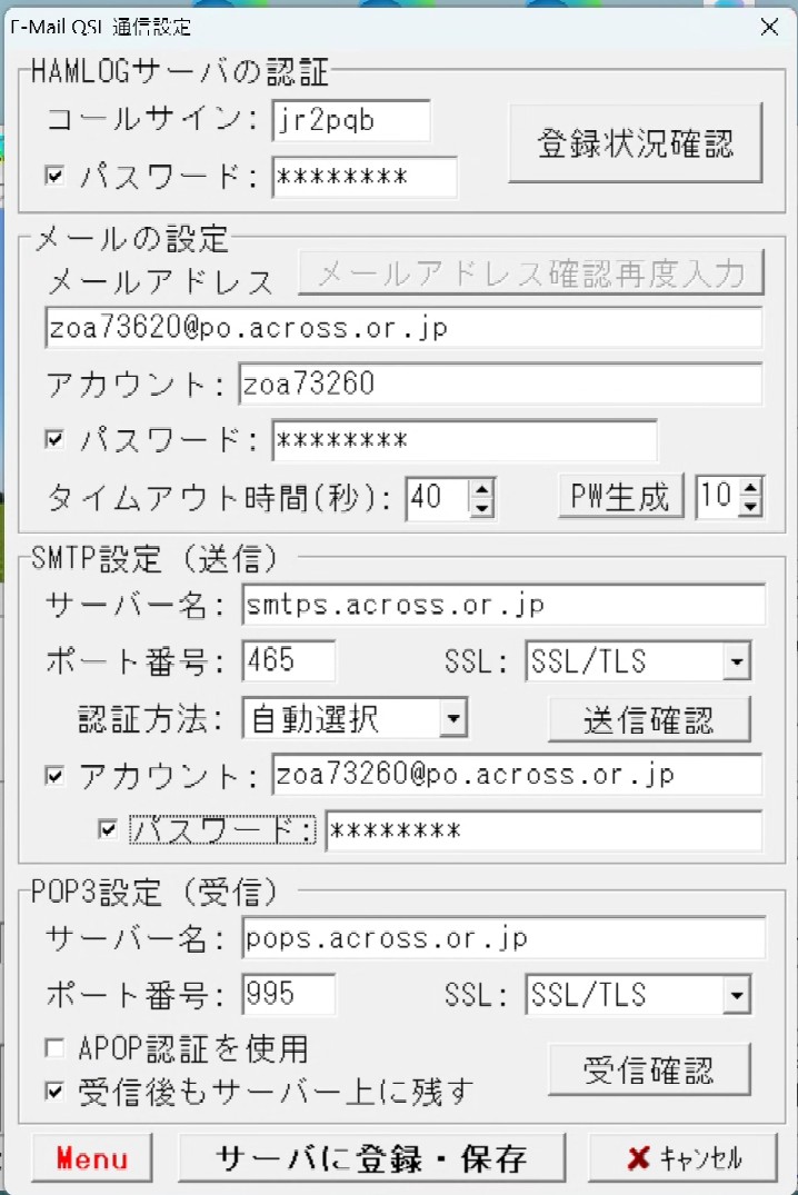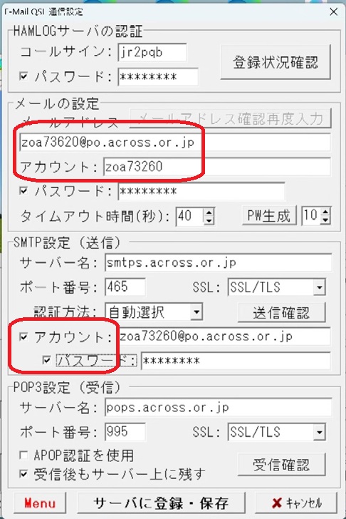 設定内容はこちらのようですが、hQSL通信設定のウインドウを見てみないと何とも言えません。