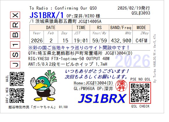#PrintA 6, 238, 8,"ファーストQSOありがとうございました。" ;ファースト...