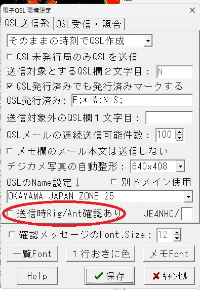 > 環境設定の電子QSL環境設定に送信時Rig/Ant確認ありにチェックを入れれば出来ると思いますが