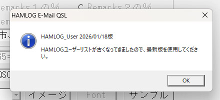 > ユーザリストの最新版をインストールしても再度インストールを要求が出てきます。HQSLの機能は出来ますがメッセージが毎回出るので面倒です。ハムログ、HQSLソフトを最新版にインストールしても同じ状況です。メッセージに今日インストールしてもメッセージ欄に2026/01/18と表示されてます。どなたか宜しくご教示お願いいたします。
