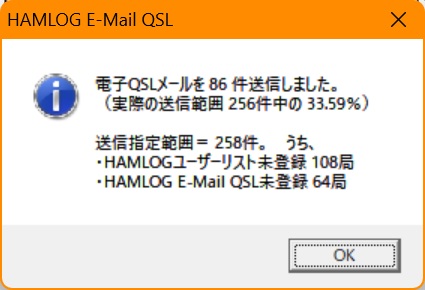 > hQSL送信件数86件 + HAMLOGユーザーリスト未登録 108局 + E-Mail QSL未登録 64局 = 258件